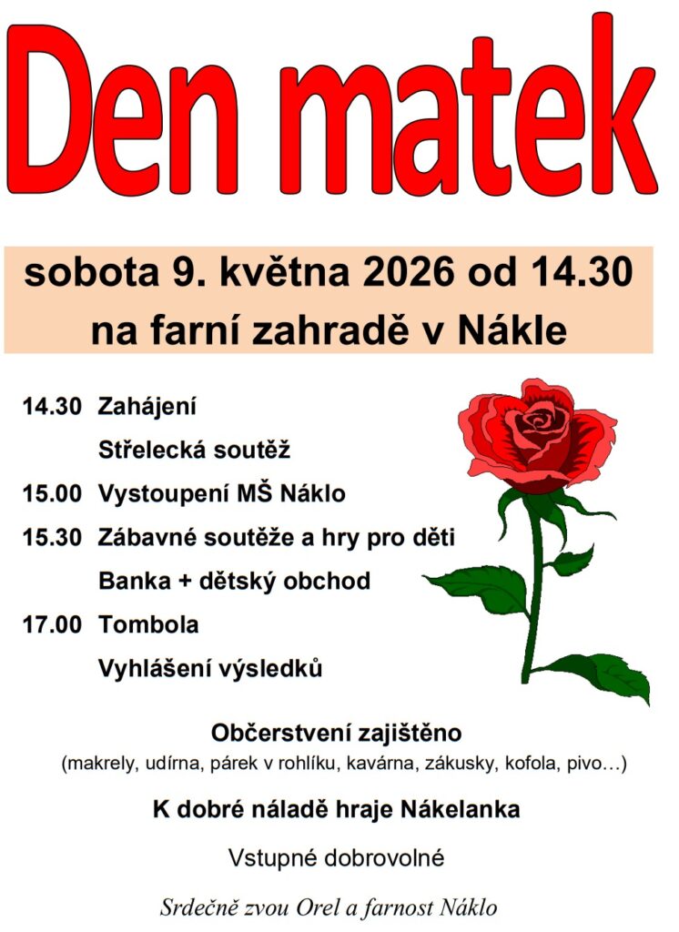 na tradiční zahradní slavnost u příležitosti Dne matek. Přijďte prožít příjemné odpoledne pro všechny generace na farní zahradě v Nákle.Program:
