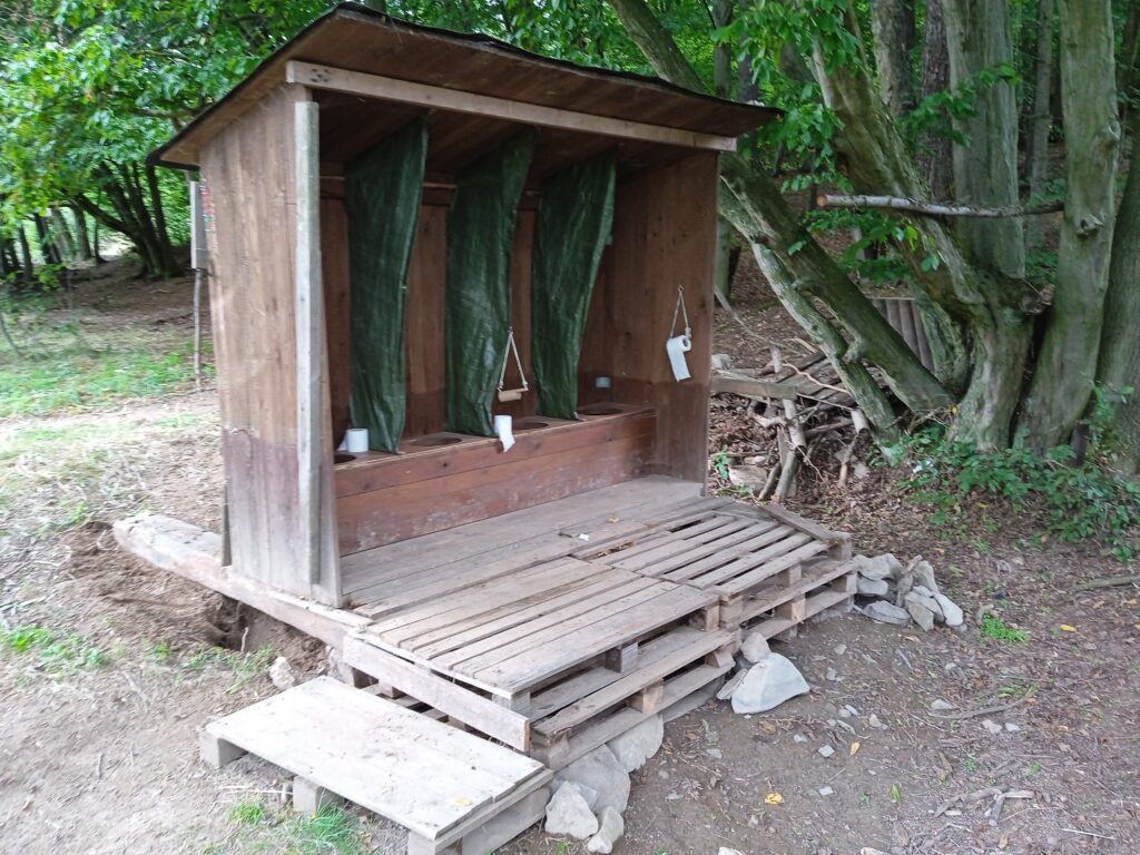 Specifickým místem jsou i záchody, naše čtyřmístné dřevěné latríny. Častokrát jsou náhodným sněmovištěm, někdy soukromým úkrytem. I starost o ně patří k povinnostem táborníků, hlavně pak večerní zahrabávání lopatami a přes den doplňování vody na mytí rukou.