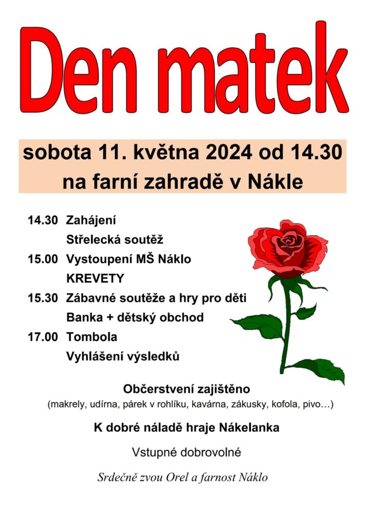 stalo se již tradicí, že druhou sobotu v květnu pořádáme Den matek. Poslední dva roky probíhal v areálu farní zahrady v Nákle a ani letos tomu nebude jinak. Zveme vás tedy 11. 5. 2024 od 14.30 do tohoto překrásného prostoru.