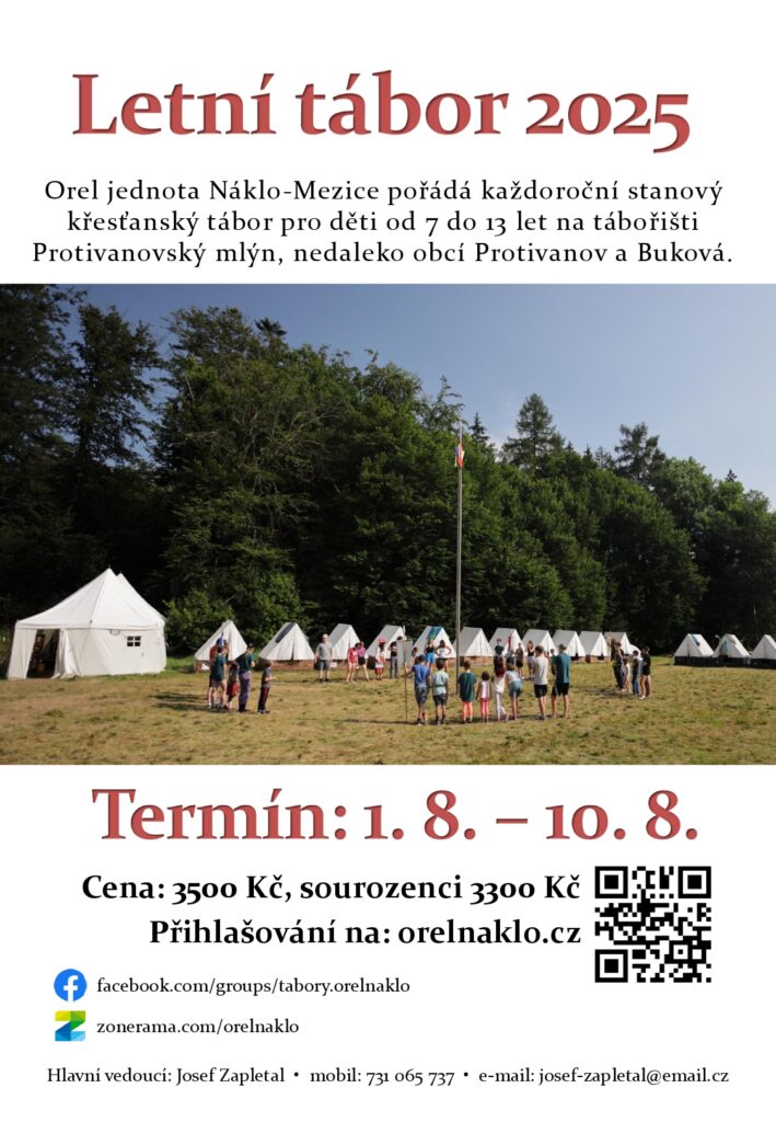 Jako každoročně pořádáme letní křesťanský tábor pro děti od 7 do 13 let. Na tábořišti Protivanovský mlýn, nedaleko obcí Protivanov a Buková, v termínu 1. 8. – 10. 8. 2025.
